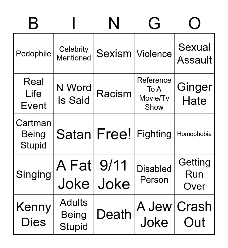 This bingo card has a free space and 24 words: Kenny Dies, A Fat Joke, Racism, A Jew Joke, Sexual Assault, Pedophile, Celebrity Mentioned, Sexism, Fighting, Homophobia, Cartman Being Stupid, N Word Is Said, Disabled Person, Getting Run Over, Real Life Event, Adults Being Stupid, Death, Violence, Ginger Hate, Singing, Satan, 9/11 Joke, Reference To A Movie/Tv Show and Crash Out.
