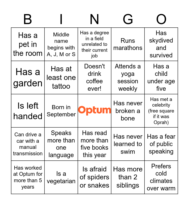 This bingo card has a free space and 24 words: Speaks more than one language, Is a vegetarian, Doesn't drink coffee ever!, Has worked at Optum for more than 5 years, Has skydived and survived, Has a pet in the room, Has a garden, Middle name begins with A, J, M or S, Has never broken a bone, Has read more than five books this year, Attends a yoga session weekly, Is left handed, Has never learned to swim, Has a fear of public speaking, Has at least one tattoo, Has more than 2 siblings, Has met a celebrity (free square if it was Oprah), Has a degree in a field unrelated to their current job, Has a child under age five, Born in September, Prefers cold climates over warm, Can drive a car with a manual transmission, Runs marathons and Is afraid of spiders or snakes.