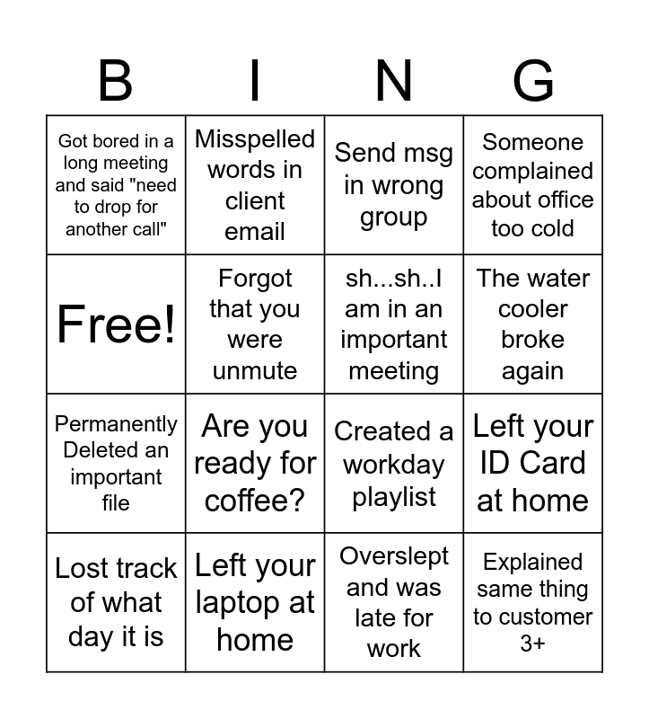 This bingo card has 16 words: Left your laptop at home, Left your ID Card at home, Send msg in wrong group, Got bored in a long meeting and said "need to drop for another call", Permanently Deleted an important file, Misspelled words in client email, Created a workday playlist, Overslept and was late for work, Free!, Forgot that you were unmute, Lost track of what day it is, Someone complained about office too cold, Are you ready for coffee?, The water cooler broke again, sh...sh..I am in an important meeting and Explained same thing to customer 3+.
