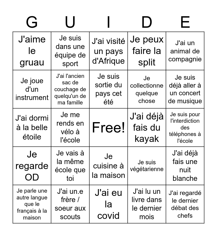 This bingo card has a free space and 24 words: Je vais à la même école que toi, J'ai un.e frère / soeur aux scouts, Je suis sortie du pays cet été, Je parle une autre langue que le français à la maison, J'ai un animal de compagnie, J'aime le gruau, Je joue d'un instrument, Je suis dans une équipe de sport, J'ai déjà fais du kayak, Je cuisine à la maison, Je collectionne quelque chose, J'ai dormi à la belle étoile, Je suis végétarienne, J'ai déjà fais une nuit blanche, J'ai l'ancien sac de couchage de quelqu'un de ma famille, J'ai lu un livre dans le dernier mois, Je suis pour l'interdiction des téléphones à l'école, J'ai visité un pays d'Afrique, Je suis déjà aller à un concert de musique, Je me rends en vélo à l'école, J'ai regardé le dernier débat des chefs, Je regarde OD, Je peux faire la split and J'ai eu la covid.