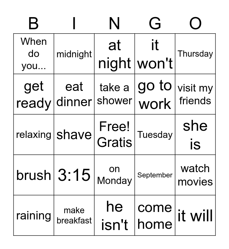 This bingo card has a free space and 34 words: afternoon, come home, o'clock, will it, brush, eat dinner, Thursday, raining, midnight, get ready, take a shower, at night, eleventh (11th), storming, Tuesday, visit my friends, make breakfast, relaxing, 3:15, September, on Monday, won't, When do you..., she is, he isn't, it will, it won't, April, go to work, get ready, he doesn't, shave, watch movies and evening.