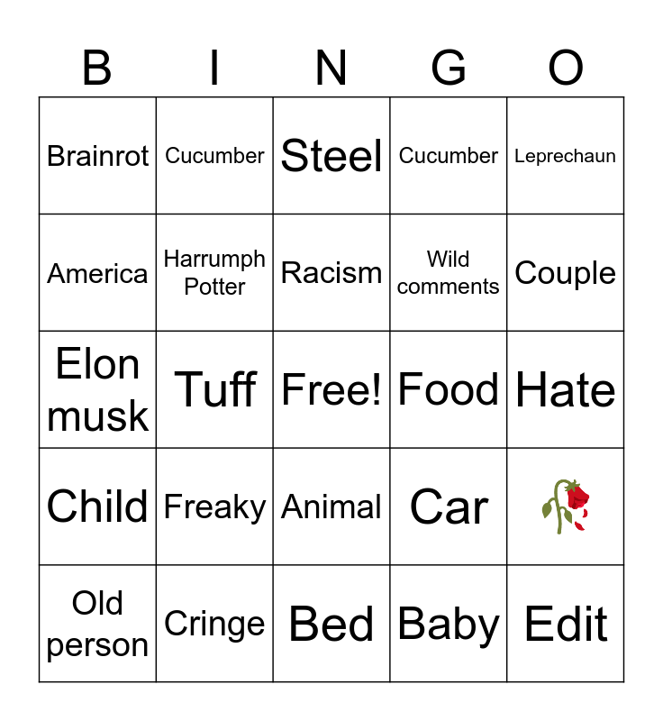 This bingo card has a free space and 24 words: Freaky, Cringe, Racism, Old person, Leprechaun, Brainrot, America, Cucumber, Food, Animal, Wild comments, Elon musk, Car, 🥀, Harrumph Potter, Baby, Hate, Steel, Couple, Tuff, Edit, Child, Cucumber and Bed.