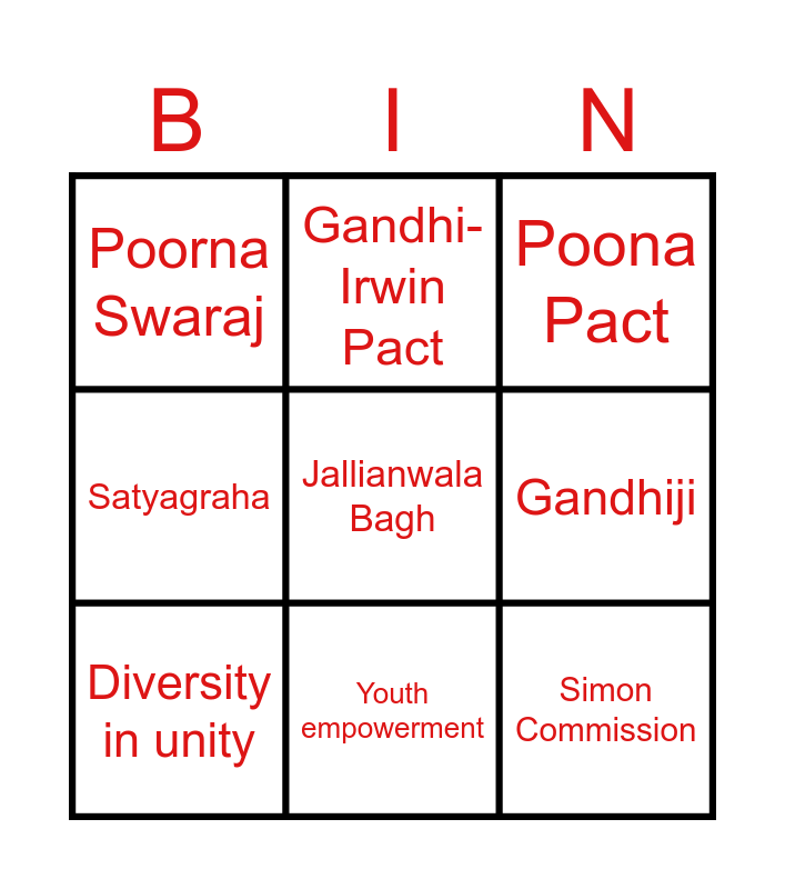 This bingo card has a free space and 24 words: Satyagraha, Non Cooperation Movement, Dandi March, Chauri- Chaura incident, Simon Commission, Poorna Swaraj, Gandhi- Irwin Pact, Poona Pact, Republic Day, National language, Economic self-reliance, Civic pride, National borders, Global citizenship, Diversity in unity, Community service, India Gate, Satyagraha, Youth empowerment, Bhagat Singh, Dandi March, Independence Day, Gandhiji and Constitutional values.