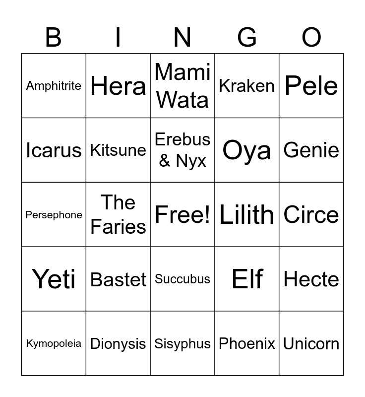 This bingo card has a free space and 24 words: Bastet, Dionysis, Erebus & Nyx, Kymopoleia, Pele, Amphitrite, Icarus, Hera, Lilith, Succubus, Oya, Persephone, Elf, Hecte, Kitsune, Phoenix, Circe, Mami Wata, Genie, The Faries, Unicorn, Yeti, Kraken and Sisyphus.
