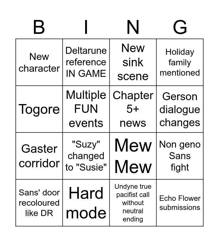 This bingo card has 16 words: Hard mode, Non geno Sans fight, New sink scene, New character, Gaster corridor, Deltarune reference IN GAME, Mew Mew, Undyne true pacifist call without neutral ending, Togore, Multiple FUN events, Sans' door recoloured like DR, Holiday family mentioned, "Suzy" changed to "Susie", Gerson dialogue changes, Chapter 5+ news and Echo Flower submissions.