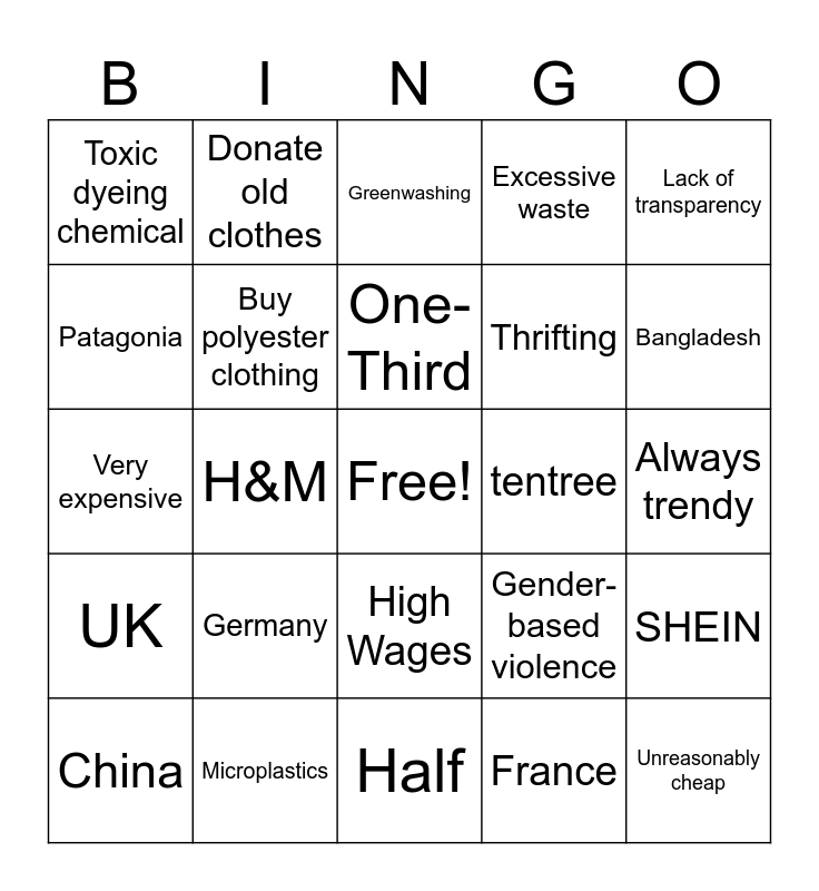 This bingo card has a free space and 24 words: Germany, Microplastics, One-Third, China, Lack of transparency, Toxic dyeing chemical, Patagonia, Donate old clothes, tentree, High Wages, Thrifting, Very expensive, Gender-based violence, SHEIN, Buy polyester clothing, France, Always trendy, Greenwashing, Bangladesh, H&M, Unreasonably cheap, UK, Excessive waste and Half.
