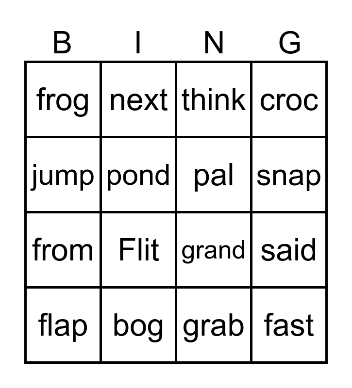 This bingo card has 18 words: Flit, fast, think, frog, grand, croc, flap, next, snap, from, grab, jump, said, pond, pal, swim, bog and food.