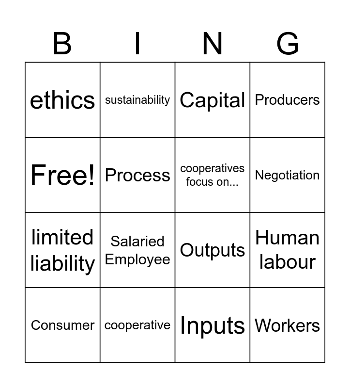This bingo card has 16 words: cooperative, Human labour, Capital, ethics, limited liability, sustainability, Outputs, Inputs, Free!, Process, Consumer, Producers, Salaried Employee, Negotiation, cooperatives focus on... and Workers.