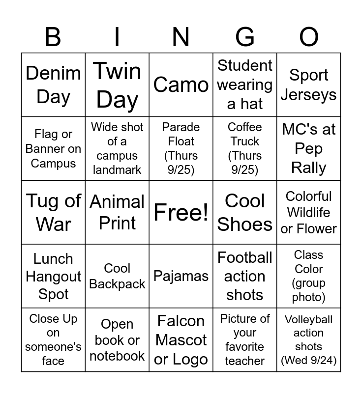 This bingo card has a free space and 24 words: Cool Backpack, Open book or notebook, Parade Float (Thurs 9/25), Close Up on someone's face, Sport Jerseys, Denim Day, Flag or Banner on Campus, Twin Day, Cool Shoes, Pajamas, Coffee Truck (Thurs 9/25), Tug of War, Football action shots, Class Color (group photo), Wide shot of a campus landmark, Picture of your favorite teacher, Colorful Wildlife or Flower, Camo, MC's at Pep Rally, Animal Print, Volleyball action shots (Wed 9/24), Lunch Hangout Spot, Student wearing a hat and Falcon Mascot or Logo.