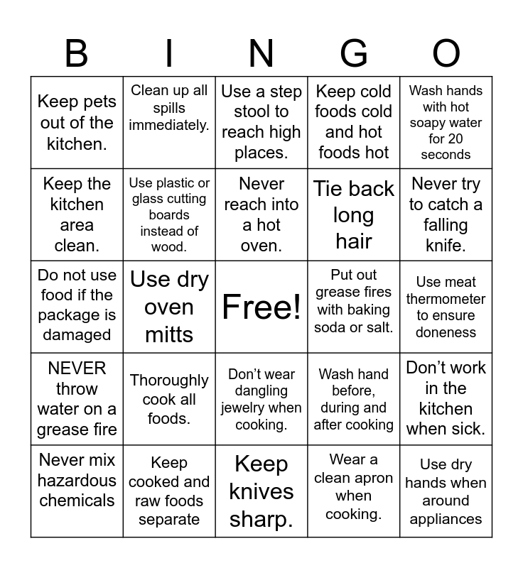This bingo card has a free space and 28 words: Don’t work in the kitchen when sick., Wear closed toe shoes in the kitchen., Tie back long hair, Wear a clean apron when cooking., Keep the kitchen area clean., Use a step stool to reach high places., Clean up all spills immediately., NEVER throw water on a grease fire, Put out grease fires with baking soda or salt., Never mix hazardous chemicals, Do not use food if the package is damaged, Keep cold foods cold and hot foods hot, Keep cooked and raw foods separate, Keep knives sharp., Never try to catch a falling knife., Do not put knives into soapy water., Thoroughly cook all foods., Use plastic or glass cutting boards instead of wood., Never reach into a hot oven., Don’t wear dangling jewelry when cooking., Keep pets out of the kitchen., Do not pull on electrical cord to unplug equipment, Use dry hands when around appliances, Use dry oven mitts, Use meat thermometer to ensure doneness, Wash hand before, during and after cooking, Wash hands with hot soapy water for 20 seconds and Never store food under the sink..