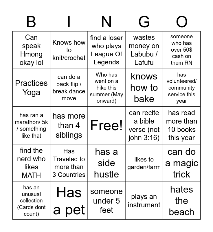 This bingo card has a free space and 24 words: Has Traveled to more than 3 Countries, Has a pet, Who has went on a hike this summer (May onward), has an unusual collection (Cards dont count), someone who has over 50$ cash on them RN, Can speak Hmong okay lol, Practices Yoga, Knows how to knit/crochet, can recite a bible verse (not john 3:16), has a side hustle, knows how to bake, has ran a marathon/ 5k / something like that, likes to garden/farm, can do a magic trick, can do a back flip / break dance move, plays an instrument, has read more than 10 books this year, find a loser who plays League Of Legends, has volunteered/ community service this year, has more than 4 siblings, hates the beach, find the nerd who likes MATH, wastes money on Labubu / Lafufu and someone under 5 feet.
