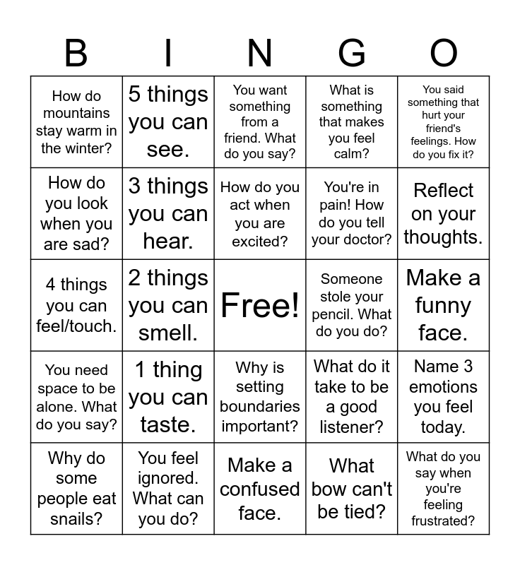 This bingo card has a free space and 24 words: 1 thing you can taste., You feel ignored. What can you do?, How do you act when you are excited?, Why do some people eat snails?, You said something that hurt your friend's feelings. How do you fix it?, How do mountains stay warm in the winter?, How do you look when you are sad?, 5 things you can see., Someone stole your pencil. What do you do?, Why is setting boundaries important?, You're in pain! How do you tell your doctor?, 4 things you can feel/touch., What do it take to be a good listener?, Name 3 emotions you feel today., 3 things you can hear., What bow can't be tied?, Make a funny face., You want something from a friend. What do you say?, Reflect on your thoughts., 2 things you can smell., What do you say when you're feeling frustrated?, You need space to be alone. What do you say?, What is something that makes you feel calm? and Make a confused face..