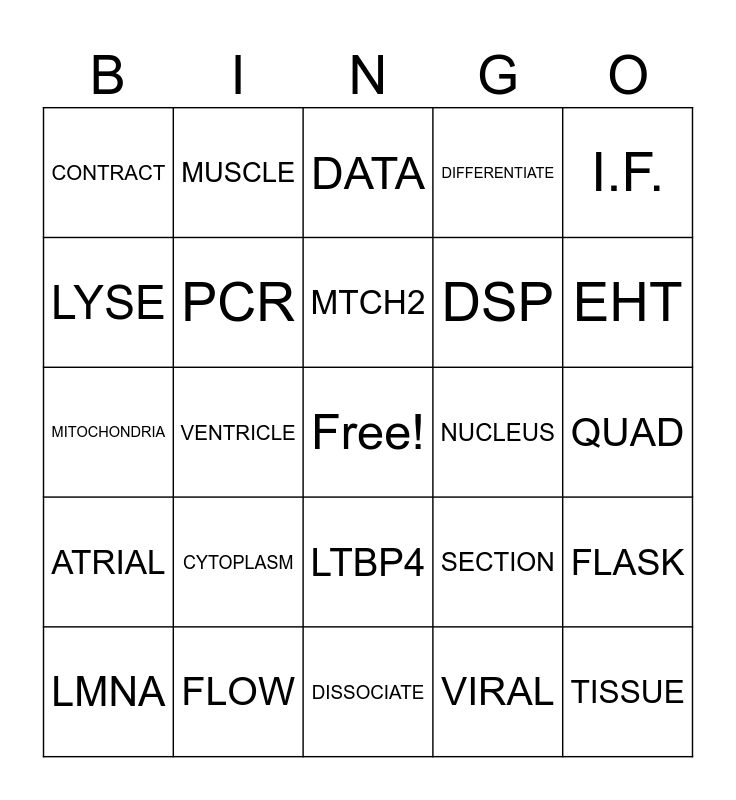 This bingo card has a free space and 39 words: DNA, RNA, PROTEIN, PCR, LMNA, LTBP4, MTCH2, DSP, I.F., ATRIAL, VENTRICLE, DIFFERENTIATE, TISSUE, QUAD, NUCLEUS, CYTOPLASM, BEAT, CONTRACT, SEQ, SECTION, LYSE, DISSOCIATE, DSP, EHT, RHYTHM, PACING, MATRIX, STAIN, MOUSE, MUSCLE, CELL, CULTURE, DATA, FLOW, VIRAL, LEG, FLASK, MITOCHONDRIA and GENE.