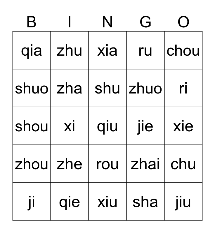 This bingo card has a free space and 29 words: ji, qi, xi, jia, qia, xia, zha, zhe, jie, qie, xie, jiu, xiu, sha, ri, rao, rou, zhou, chou, shou, zhai, chai, zhuo, shuo, ru, zhu, chu, shu and rui.
