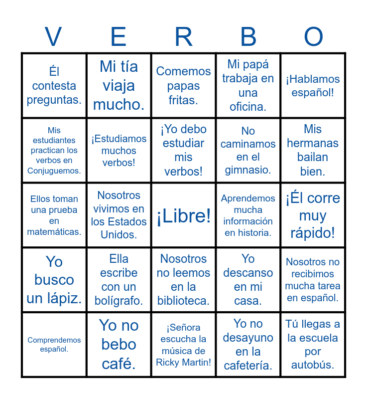 This bingo card has a free space and 29 words: Comprendemos español., Yo llevo una mochila., Nosotros vivimos en los Estados Unidos., Mi hermano mira la pizarra., Él contesta preguntas., Comemos papas fritas., ¡Estudiamos muchos verbos!, Ella escribe con un bolígrafo., Aprendemos mucha información en historia., Yo no bebo café., ¡Él corre muy rápido!, Tú llegas a la escuela por autobús., ¡Señora escucha la música de Ricky Martin!, Yo no desayuno en la cafetería., Mis hermanas bailan bien., Nosotros asistimos a escuela a las ocho de la mañana., Nosotros no leemos en la biblioteca., Yo busco un lápiz., ¡Hablamos español!, Ellos toman una prueba en matemáticas., Yo descanso en mi casa., ¡`Señora compra muchos dulces!, No caminamos en el gimnasio., Mis estudiantes practican los verbos en Conjuguemos., Mi papá trabaja en una oficina., Mi tía viaja mucho., Nosotros no recibimos mucha tarea en español., ¡Yo debo estudiar mis verbos! and ¡Nosotros miramos el video de "AR, ER, IR Bling!".