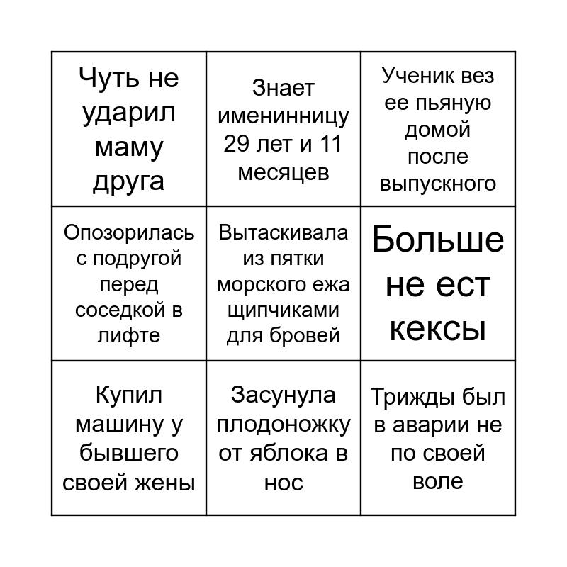 This bingo card has 14 words: Променяла художку на хомяков, Попала в аварию и скрылась с места ДТП, Купил машину у бывшего своей жены, Знает именинницу 29 лет и 11 месяцев, Опозорилась с подругой перед соседкой в лифте, Вытаскивала из пятки морского ежа щипчиками для бровей, Трижды был в аварии не по своей воле, Победил в собственном турнире по DOTA, Засунула плодоножку от яблока в нос, Чуть не ударил маму друга, Непутевая мать в глазах соседей, Больше не ест кексы, Ученик вез ее пьяную домой после выпускного and Пранканула коллегу по работе.