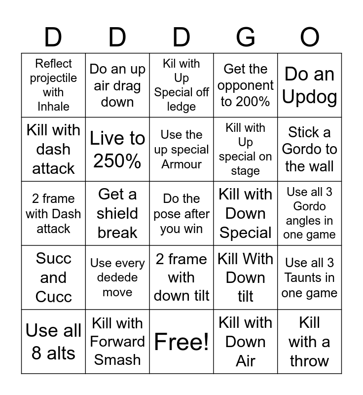 This bingo card has 25 words: Succ and Cucc, Kill with Forward Smash, Do the pose after you win, Kill with Down Air, Do an Updog, Reflect projectile with Inhale, Do an up air drag down, Kil with Up Special off ledge, Kill with Down Special, Use all 3 Taunts in one game, Kill with dash attack, Live to 250%, Free!, Kill With Down tilt, Stick a Gordo to the wall, Use all 8 alts, Get a shield break, Use the up special Armour, Kill with Up special on stage, Use all 3 Gordo angles in one game, 2 frame with Dash attack, Use every dedede move, 2 frame with down tilt, Get the opponent to 200% and Kill with a throw.