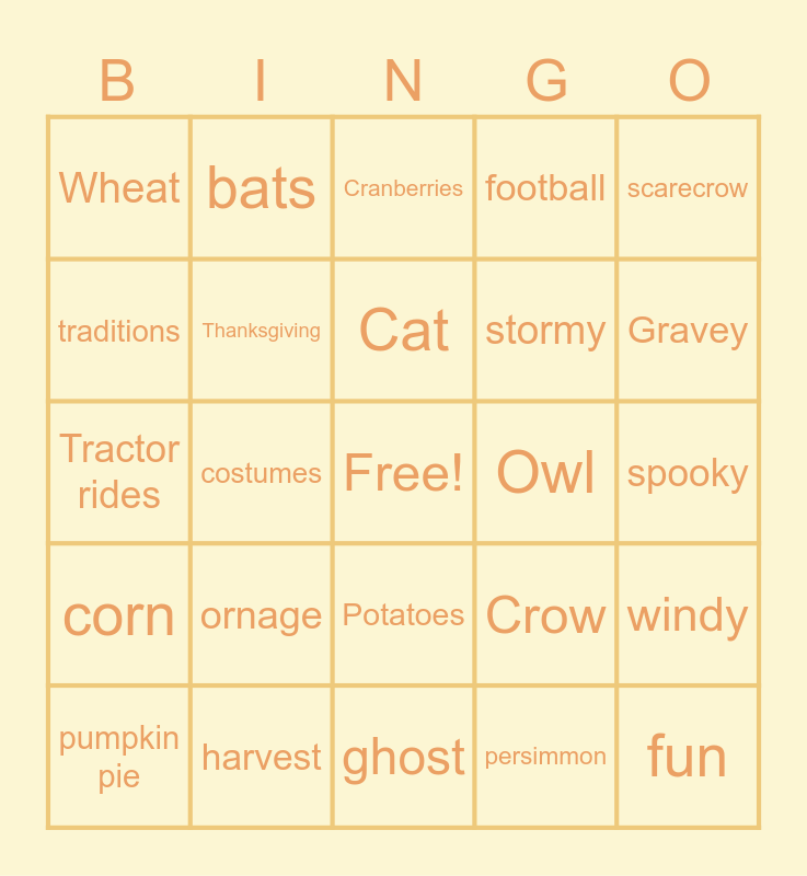 This bingo card has a free space and 34 words: Turkey, persimmon, pumpkin, Halloween, corn, Thanksgiving, scarecrow, pumpkin pie, bats, red, Cat, Cranberries, pumpkin patch, yellow, Owl, Gravey, harvest, Tractor rides, ornage, Crow, Potatoes, Haybales, Wheat, spooky, ghost, fun, football, cloudy, stormy, traditions, decorations, costumes, windy and rainy.