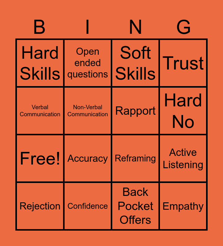 This bingo card has 20 words: Active Listening, Objection, Soft Skills, Value, Rejection, Verbal Communication, Confidence, Hard Skills, Free!, Open ended questions, Accuracy, Reframing, Non-Verbal Communication, Empathy, Rapport, Gratitude, Hard No, Trust, Back Pocket Offers and Ownership.