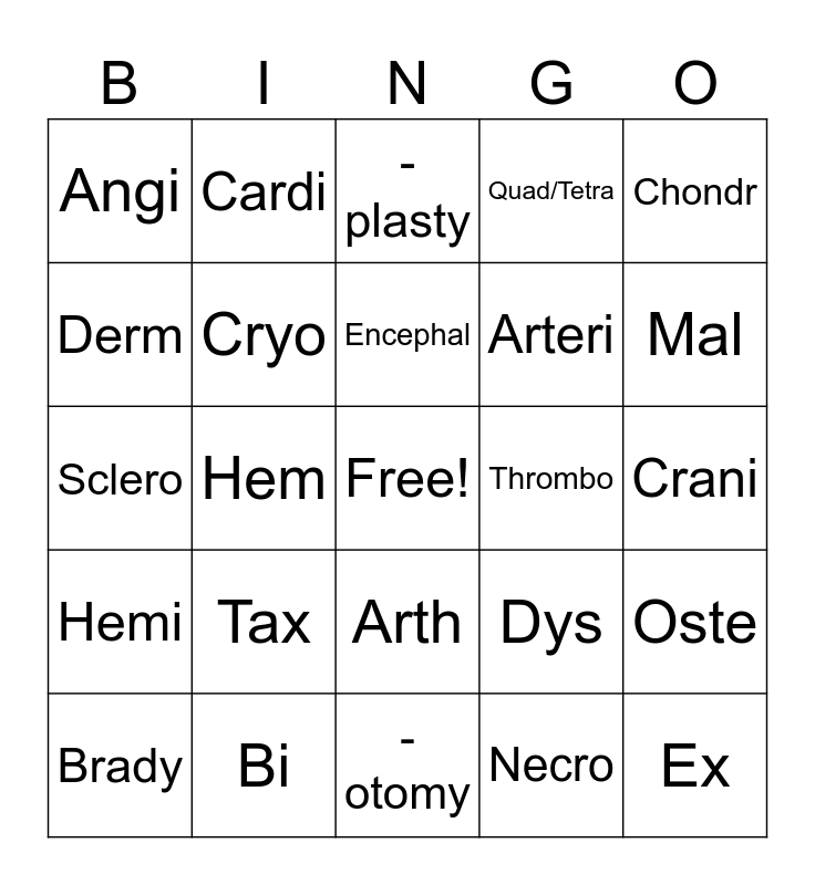 This bingo card has a free space and 65 words: My, Myel, Neur, Oste, Pneum, Ton, Cardi, Cephal, Encephal, Cervic, Arth, Kinesi, Crani, Chondr, Cost, Derm, Hem, Angi, Vas, Arteri, Tax, Hemi, Quad/Tetra, Para, A, An, Hyper, Hypo, En, In, Ex, Anti, Brady, Tachy, Contra, Ipsi, Dys, Bi, Poly, Sclero, Necro, Ankylo, Cryo, Cyano, Thrombo, Inter, Intra, Trans, Mal, -ia, -itis, -algia, -oma, -path, -ectomy, -otomy, -paenia, -logy, -osis, -plasty, -ist, -trophy, -cele, -paresis, -plegia, -phasia and -phagia.