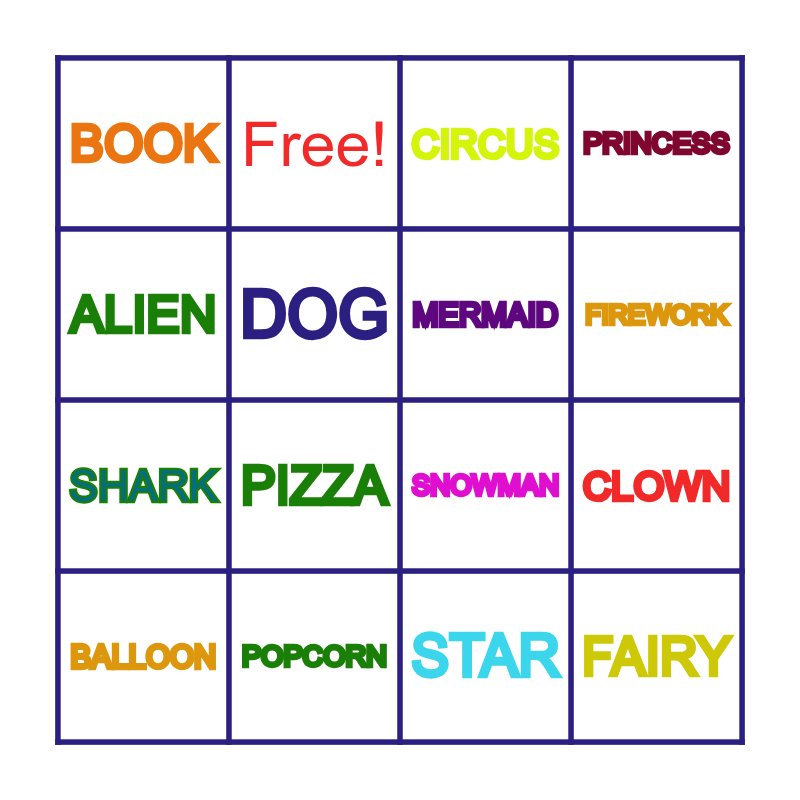 This bingo card has 32 words: DRAGON, UNICORN, CLOWN, MONSTER, FAIRY, MERMAID, ALIEN, CANDY, Free!, ICE CREAM, FIREWORK, CIRCUS, ROCKET, BURGER, POPCORN, DONUT, CUPCAKE, SNOWMAN, PUMPKIN, GHOST, CLOUD, THUNDER, STAR, BROOM, BALLOON, PRINCESS, SHARK, DOG, BOOK, KITE, UMBRELLA and PIZZA.