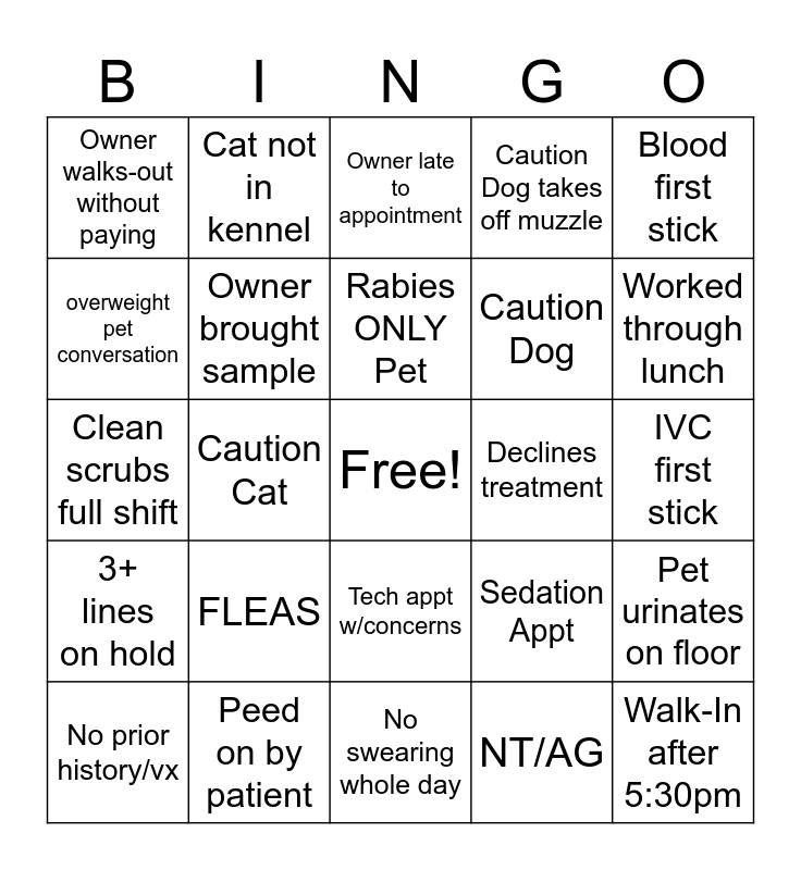 This bingo card has a free space and 24 words: FLEAS, Peed on by patient, Rabies ONLY Pet, No prior history/vx, Blood first stick, Owner walks-out without paying, overweight pet conversation, Cat not in kennel, Declines treatment, Tech appt w/concerns, Caution Dog, Clean scrubs full shift, Sedation Appt, Pet urinates on floor, Owner brought sample, NT/AG, IVC first stick, Owner late to appointment, Worked through lunch, Caution Cat, Walk-In after 5:30pm, 3+ lines on hold, Caution Dog takes off muzzle and No swearing whole day.