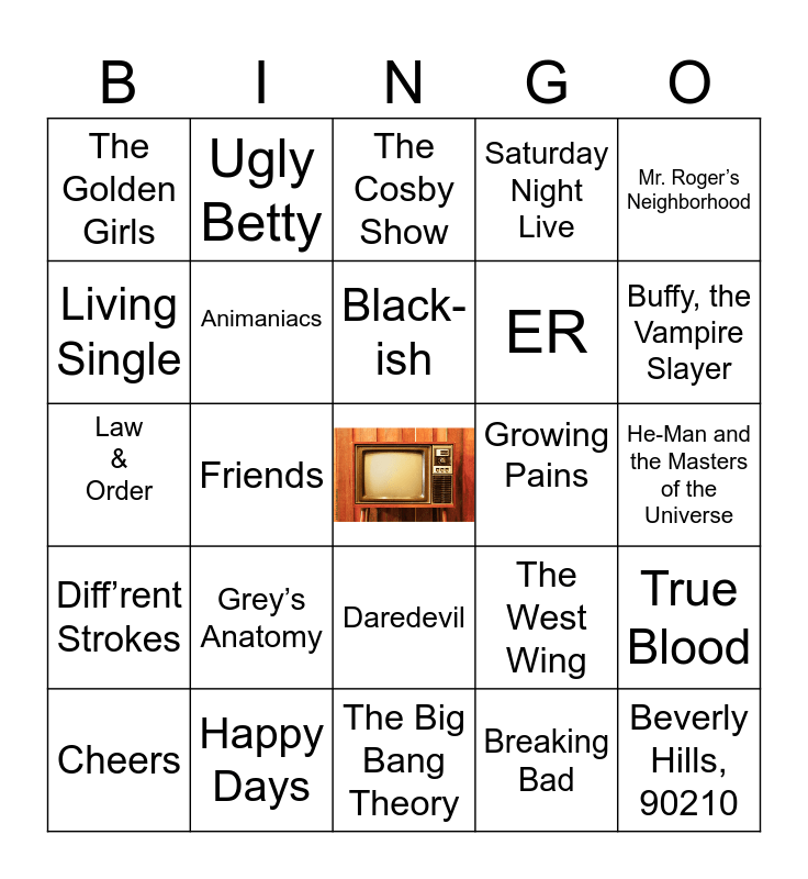 This bingo card has a free space and 29 words: Cheers, All in the Family, Friends, Perfect Strangers, The Golden Girls, The Cosby Show, Animaniacs, Grey’s Anatomy, Growing Pains, Happy Days, He-Man and the Masters of the Universe, Beverly Hills, 90210, The Big Bang Theory, Breaking Bad, Buffy, the Vampire Slayer, The Carol Burnett Show, Daredevil, Diff’rent Strokes, Mr. Roger’s Neighborhood, Law & Order, The West Wing, The Fresh Prince of Bel-Air, ER, Living Single, Saturday Night Live, Ugly Betty, True Blood, Black-ish and 21 Jump Street.