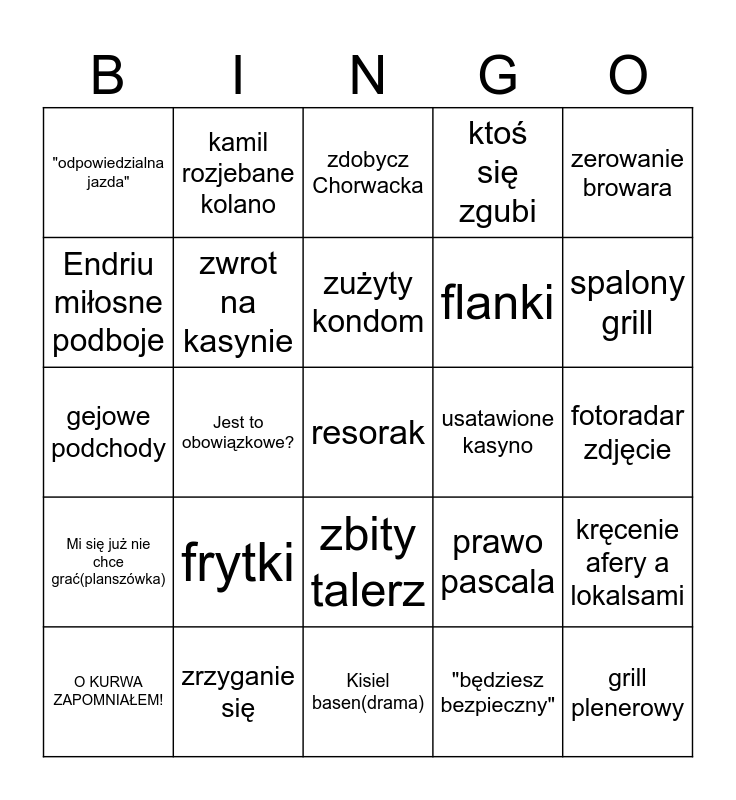This bingo card has a free space and 24 words: frytki, zrzyganie się, zużyty kondom, O KURWA ZAPOMNIAŁEM!, zerowanie browara, "odpowiedzialna jazda", Endriu miłosne podboje, kamil rozjebane kolano, usatawione kasyno, zbity talerz, flanki, gejowe podchody, prawo pascala, kręcenie afery a lokalsami, zwrot na kasynie, "będziesz bezpieczny", fotoradar zdjęcie, zdobycz Chorwacka, spalony grill, Jest to obowiązkowe?, grill plenerowy, Mi się już nie chce grać(planszówka), ktoś się zgubi and Kisiel basen(drama).