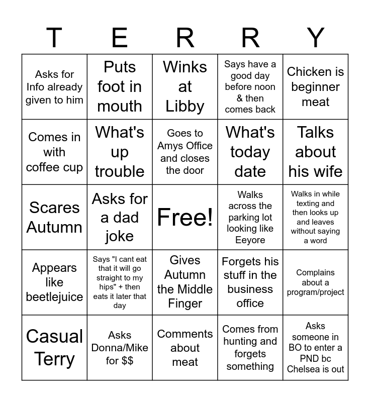 This bingo card has a free space and 26 words: Gives Autumn the Middle Finger, Comes from hunting and forgets something, Goes to Amys Office and closes the door, Asks Donna/Mike for $$, Chicken is beginner meat, Asks for Info already given to him, Comes in with coffee cup, Puts foot in mouth, Walks in while texting and then looks up and leaves without saying a word, Forgets his stuff in the business office, What's today date, Scares Autumn, Complains about a program/project, Casual Terry, Asks for a dad joke, Complains about amount of invoices he has to sign, Says have a good day before noon & then comes back, Appears like beetlejuice, Winks at Libby, Asks someone in BO to enter a PND bc Chelsea is out, Talks about his wife, Comments about meat, Walks across the parking lot looking like Eeyore, Says "I cant eat that it will go straight to my hips" + then eats it later that day, What's up trouble and What's that green thing you are eating.