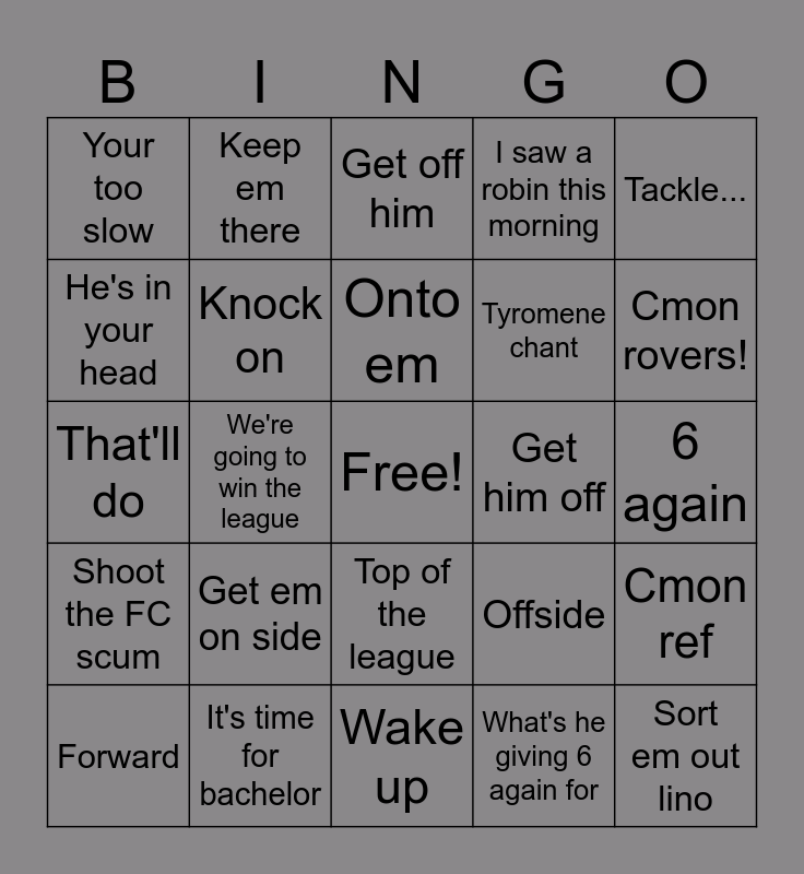 This bingo card has a free space and 24 words: Forward, Get em on side, Onto em, What's he giving 6 again for, Tackle..., Your too slow, Keep em there, Get off him, Get him off, 6 again, That'll do, Knock on, Offside, Cmon ref, He's in your head, It's time for bachelor, Wake up, I saw a robin this morning, Cmon rovers!, Shoot the FC scum, We're going to win the league, Top of the league, Tyromene chant and Sort em out lino.