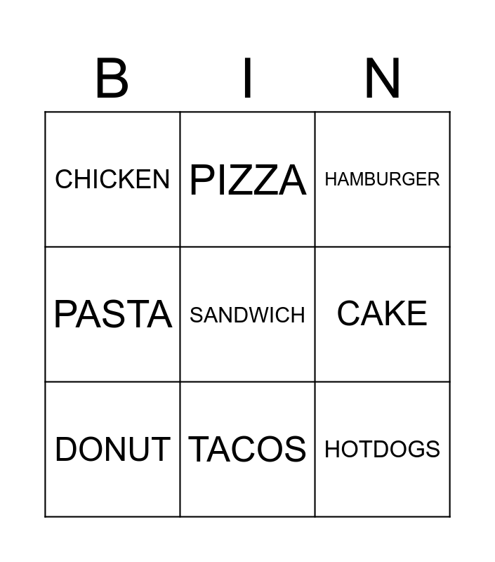This bingo card has a free space and 8 words: CAKE, HAMBURGER, PIZZA, DONUT, CHICKEN, HOTDOGS, PASTA and TACOS.