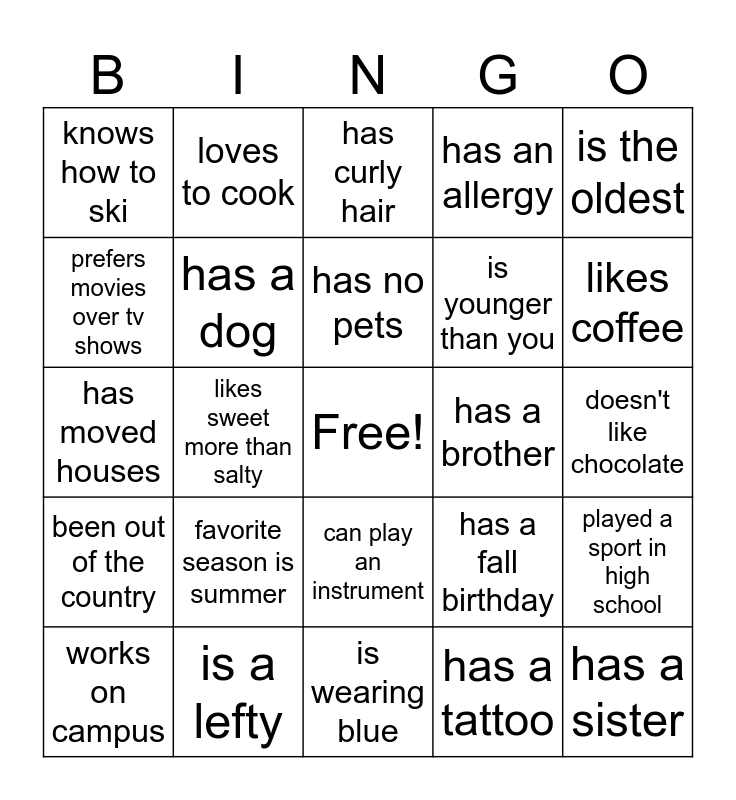 This bingo card has a free space and 24 words: favorite season is summer, is a lefty, has no pets, works on campus, is the oldest, knows how to ski, prefers movies over tv shows, loves to cook, has a brother, can play an instrument, is younger than you, has moved houses, has a fall birthday, played a sport in high school, has a dog, has a tattoo, doesn't like chocolate, has curly hair, likes coffee, likes sweet more than salty, has a sister, been out of the country, has an allergy and is wearing blue.