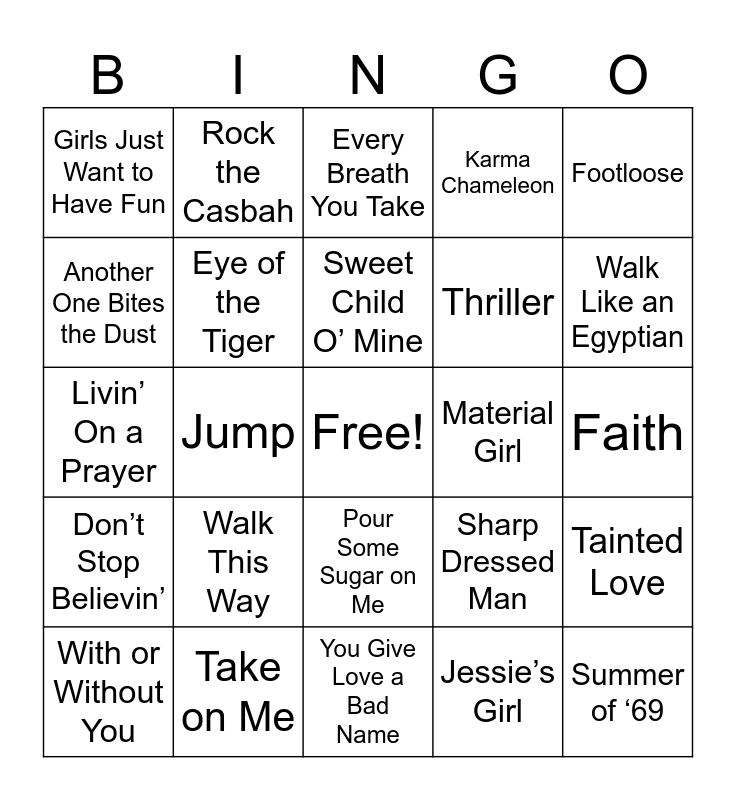 This bingo card has a free space and 40 words: Billie Jean, Livin’ On a Prayer, Like a Virgin, Eye of the Tiger, Take on Me, Pour Some Sugar on Me, Sweet Child O’ Mine, Wake Me Up Before You Go-Go, Footloose, Don’t Stop Believin’, Jump, Karma Chameleon, Summer of ‘69, Faith, Material Girl, Walk This Way, Sweet Dreams (Are Made of This), Girls Just Want to Have Fun, You Spin Me Round (Like a Record), Every Breath You Take, Tainted Love, Jessie’s Girl, Thriller, Another One Bites the Dust, She Drives Me Crazy, Fight for Your Right, 867-5309 / Jenny, Addicted to Love, Maniac, Let’s Dance, Dancing in the Dark, With or Without You, I Wanna Dance with Somebody, Sharp Dressed Man, Walk Like an Egyptian, You Give Love a Bad Name, Hold Me Now, Celebration, Rock the Casbah and Take My Breath Away.