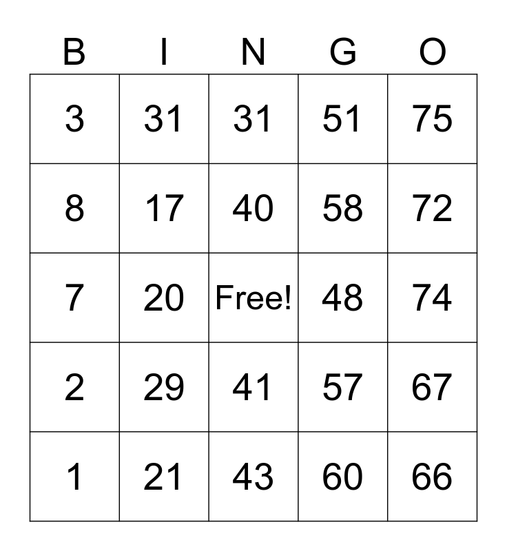This bingo card has a free space and 24 words: 1, 29, 40, 60, 75, 3, 31, 31, 48, 74, 7, 17, 57, 67, 8, 21, 43, 51, 72, 2, 20, 41, 58 and 66.