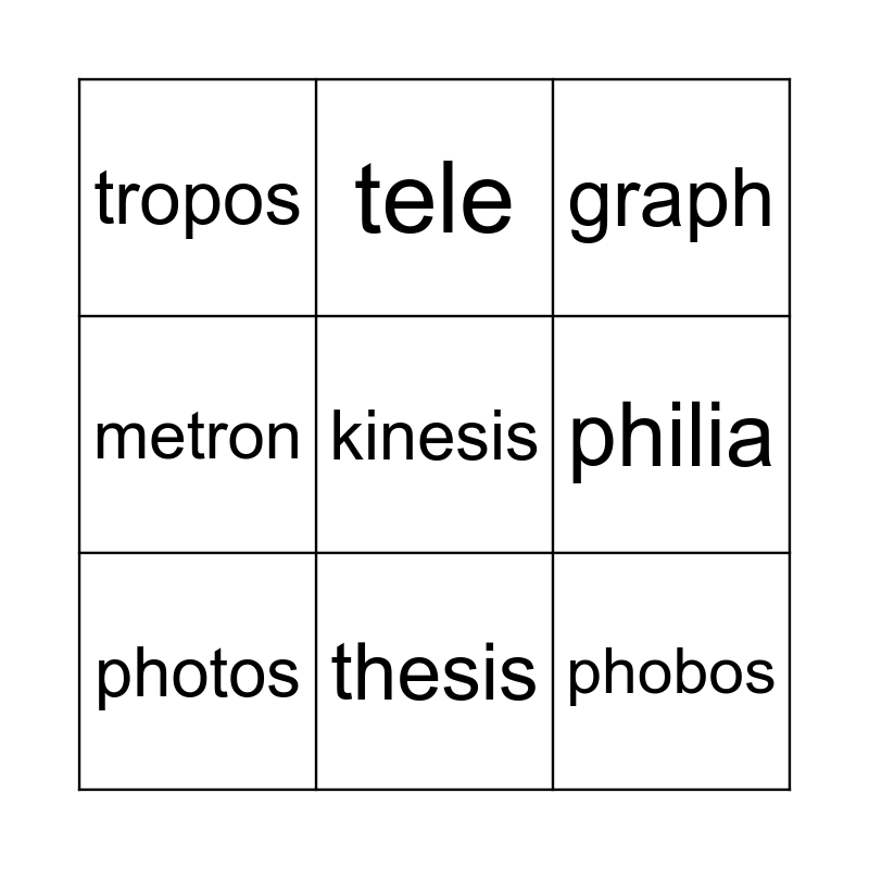 This bingo card has a free space and 9 words: photos, graph, tele, metron, tropos, philia, phobos, syn sym and thesis.