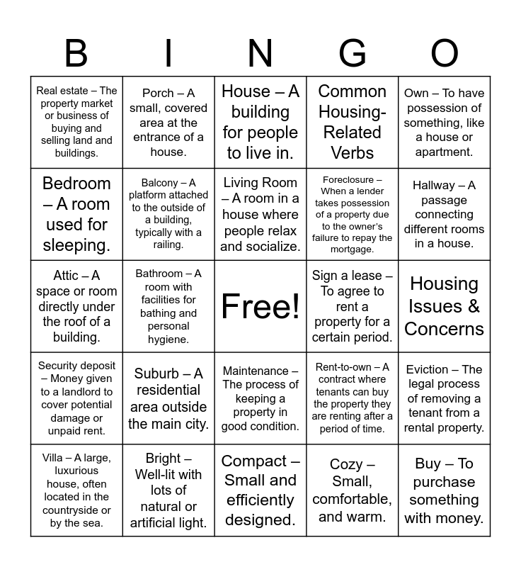 This bingo card has a free space and 74 words: Types of Housing, Apartment – A set of rooms forming a self-contained unit in a building., House – A building for people to live in., Condo (Condominium) – A building or complex with individually owned apartments or units., Townhouse – A narrow, multi-story house that is attached to other similar houses., Studio – A small apartment with one main room, typically a bedroom, living room, and kitchen in a single space., Duplex – A house divided into two separate units., Cottage – A small, typically rural house., Villa – A large, luxurious house, often located in the countryside or by the sea., Mobile Home – A prefabricated home that is usually placed in a mobile home park., Loft – A large, open space, often in an industrial building, converted into a living area., Parts of a House, Living Room – A room in a house where people relax and socialize., Bedroom – A room used for sleeping., Kitchen – A room for cooking and preparing food., Bathroom – A room with facilities for bathing and personal hygiene., Dining Room – A room for eating meals., Hallway – A passage connecting different rooms in a house., Basement – The lowest floor of a building, often below ground level., Attic – A space or room directly under the roof of a building., Balcony – A platform attached to the outside of a building, typically with a railing., Porch – A small, covered area at the entrance of a house., Common Housing-Related Verbs, Rent – To pay money in exchange for the use of a property., Buy – To purchase something with money., Sell – To exchange something for money., Move in – To start living in a new home., Move out – To leave a home and stop living there., Lease – A contract that allows someone to use a property for a specified period of time., Lend – To allow someone to borrow something., Own – To have possession of something, like a house or apartment., Fix – To repair something that is broken or damaged., Renovate – To improve or modernize a building, usually by repairing or redesigning parts of it., Housing-Related Adjectives, Spacious – A large or roomy area., Cozy – Small, comfortable, and warm., Modern – Featuring current or recent design styles., Old-fashioned – Outdated or traditional in style., Luxury – Very high-end, expensive, or comfortable., Affordable – Reasonably priced or within budget., Compact – Small and efficiently designed., Bright – Well-lit with lots of natural or artificial light., Sleek – Smooth and elegant in design., Furnished – Equipped with furniture., Housing-Related Places, Real estate – The property market or business of buying and selling land and buildings., Neighborhood – A district or area where people live., Suburb – A residential area outside the main city., Building – A structure with walls and a roof, like a house or office., Estate – A large property, often including a house and land., Housing complex – A group of buildings that share common areas, often with amenities., Gated community – A residential area with controlled access for safety and privacy., Housing Issues & Concerns, Mortgage – A loan specifically for buying property, usually with regular payments over a long period., Deposit – A sum of money paid as a security or guarantee when renting a property., Utilities – Basic services such as water, electricity, gas, and waste management., Maintenance – The process of keeping a property in good condition., Landlord – A person who owns a rental property., Tenant – A person who rents a property from a landlord., Eviction – The legal process of removing a tenant from a rental property., Foreclosure – When a lender takes possession of a property due to the owner’s failure to repay the mortgage., Rent increase – When the cost of renting a property goes up., Security deposit – Money given to a landlord to cover potential damage or unpaid rent., Common Housing-Related Phrases, Sign a lease – To agree to rent a property for a certain period., Move-in date – The date on which a tenant begins living in a new home., Open house – An event where a property for sale is available for viewing by potential buyers., Home inspection – A professional evaluation of a property’s condition before purchase., Rent-to-own – A contract where tenants can buy the property they are renting after a period of time., Fixer-upper – A property that needs repairs or renovation before it’s in good condition., Down payment – A partial payment made when purchasing a house, typically paid upfront., Housewarming party – A social event held after moving into a new home., In good condition – Describes a house or apartment that is well-maintained and not damaged. and For sale – Indicates that a property is available for purchase..