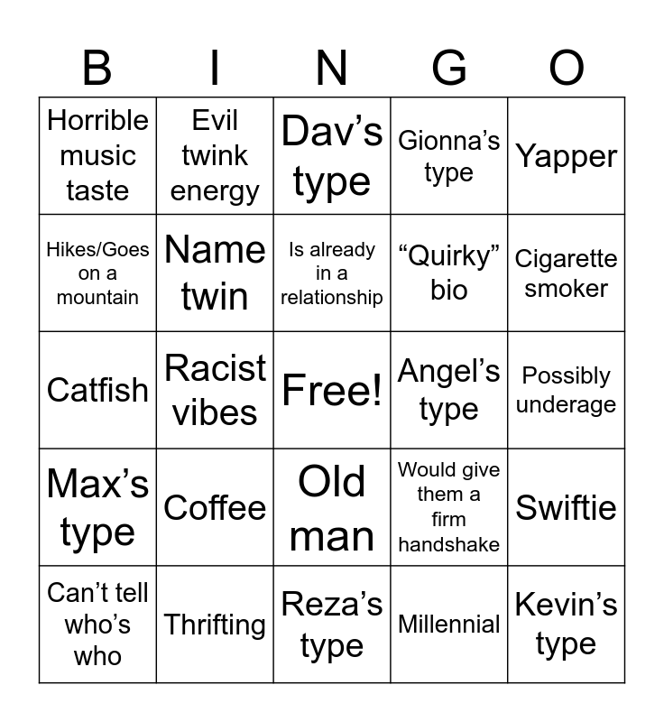 This bingo card has a free space and 24 words: Coffee, Thrifting, Is already in a relationship, Can’t tell who’s who, Yapper, Horrible music taste, Hikes/Goes on a mountain, Evil twink energy, Angel’s type, Old man, “Quirky” bio, Catfish, Would give them a firm handshake, Swiftie, Name twin, Millennial, Possibly underage, Dav’s type, Cigarette smoker, Racist vibes, Kevin’s type, Max’s type, Gionna’s type and Reza’s type.