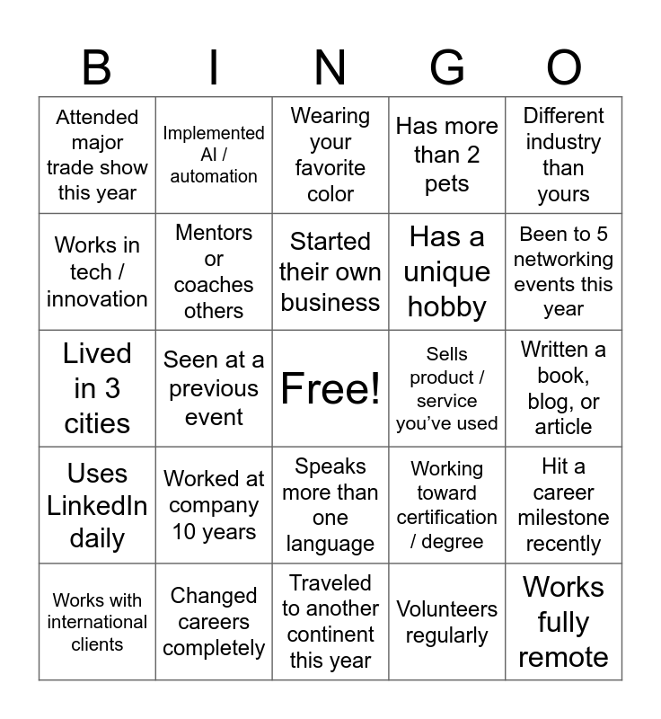 This bingo card has a free space and 24 words: Worked at company 10 years, Changed careers completely, Started their own business, Works with international clients, Different industry than yours, Attended major trade show this year, Works in tech / innovation, Implemented AI / automation, Sells product / service you’ve used, Speaks more than one language, Has a unique hobby, Lived in 3 cities, Working toward certification / degree, Hit a career milestone recently, Mentors or coaches others, Volunteers regularly, Written a book, blog, or article, Wearing your favorite color, Been to 5 networking events this year, Seen at a previous event, Works fully remote, Uses LinkedIn daily, Has more than 2 pets and Traveled to another continent this year.