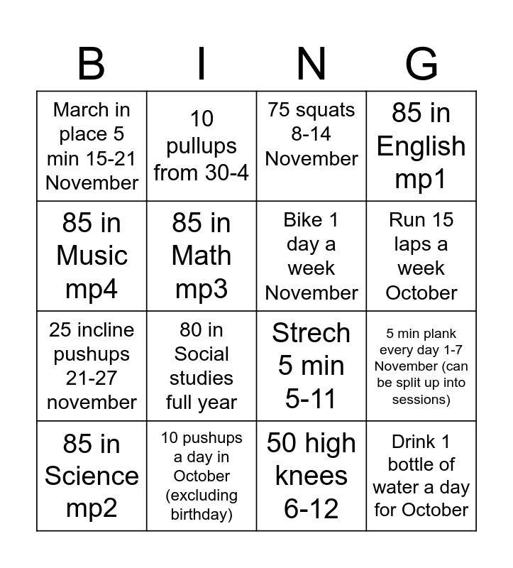 This bingo card has 16 words: 10 pushups a day in October (excluding birthday), 5 min plank every day 1-7 November (can be split up into sessions), 75 squats 8-14 November, March in place 5 min 15-21 November, 25 incline pushups 21-27 november, 10 pullups from 30-4, Strech 5 min 5-11, 50 high knees 6-12, 85 in Music mp4, 85 in Math mp3, 85 in Science mp2, 85 in English mp1, 80 in Social studies full year, Run 15 laps a week October, Bike 1 day a week November and Drink 1 bottle of water a day for October.