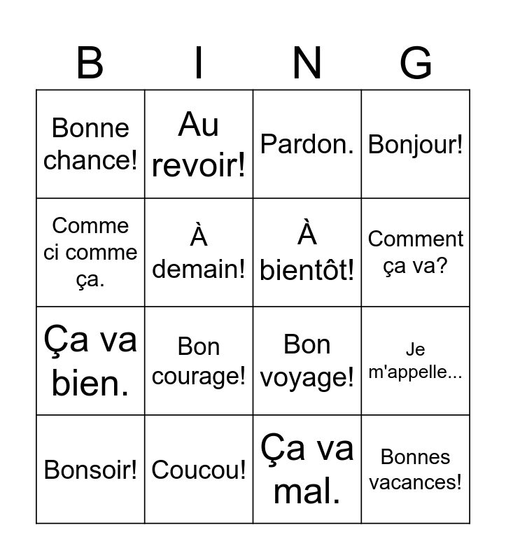 This bingo card has 18 words: Bon courage!, Bonnes vacances!, Pardon., Bonne chance!, Bon voyage!, Bonjour!, Bonsoir!, Au revoir!, Comment ça va?, Ça va bien., Ça va mal., Comme ci comme ça., Je m'appelle..., À demain!, À bientôt!, Salut!, Coucou! and Bon appétit!.