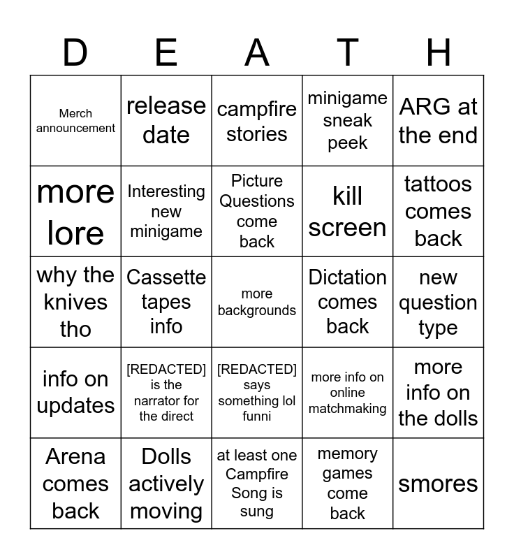 This bingo card has a free space and 24 words: [REDACTED] is the narrator for the direct, Dolls actively moving, Picture Questions come back, Arena comes back, ARG at the end, Merch announcement, more lore, release date, Dictation comes back, [REDACTED] says something lol funni, kill screen, why the knives tho, more info on online matchmaking, more info on the dolls, Interesting new minigame, memory games come back, new question type, campfire stories, tattoos comes back, Cassette tapes info, smores, info on updates, minigame sneak peek and at least one Campfire Song is sung.