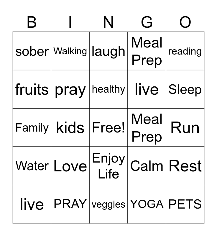 This bingo card has a free space and 24 words: Love, PRAY, healthy, live, reading, sober, fruits, Walking, Meal Prep, Enjoy Life, live, Family, Calm, Rest, pray, YOGA, Run, laugh, Sleep, kids, PETS, Water, Meal Prep and veggies.