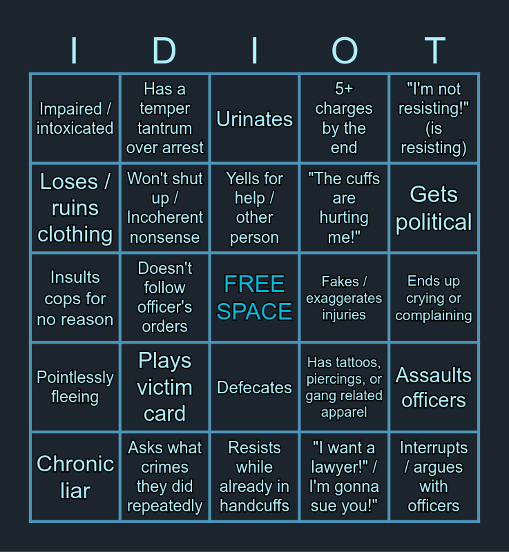 This bingo card has a free space and 24 words: Plays victim card, Asks what crimes they did repeatedly, Yells for help / other person, Chronic liar, "I'm not resisting!" (is resisting), Impaired / intoxicated, Loses / ruins clothing, Has a temper tantrum over arrest, Fakes / exaggerates injuries, Defecates, "The cuffs are hurting me!", Insults cops for no reason, Has tattoos, piercings, or gang related apparel, Assaults officers, Won't shut up / Incoherent nonsense, "I want a lawyer!" / I'm gonna sue you!", Ends up crying or complaining, Urinates, Gets political, Doesn't follow officer's orders, Interrupts / argues with officers, Pointlessly fleeing, 5+ charges by the end and Resists while already in handcuffs.