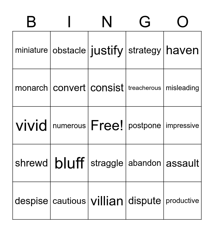 This bingo card has a free space and 24 words: bluff, cautious, consist, despise, haven, miniature, monarch, obstacle, postpone, straggle, treacherous, vivid, abandon, assault, convert, dispute, impressive, justify, misleading, numerous, productive, shrewd, strategy and villian.
