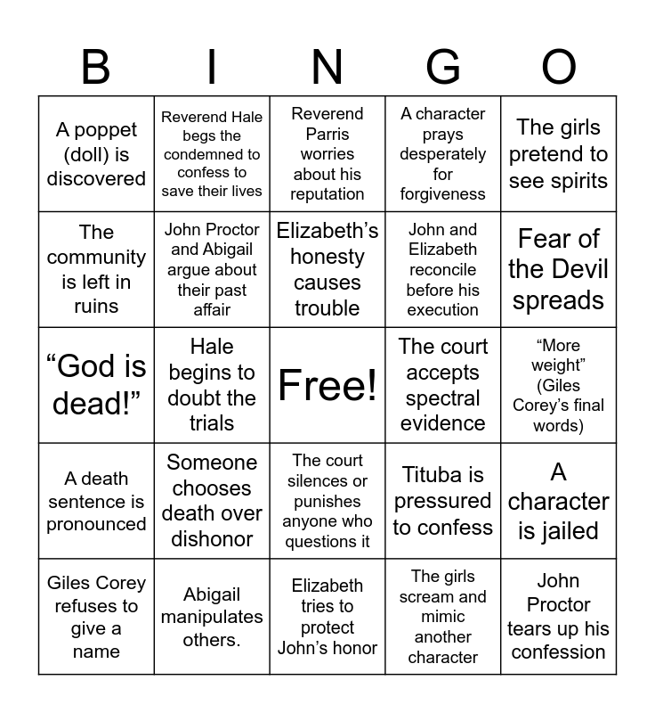 This bingo card has a free space and 29 words: A character is accused of Witchcraft, Abigail manipulates others., Reverend Parris worries about his reputation, Someone confesses to save themselves, The girls pretend to see spirits, A poppet (doll) is discovered, John Proctor and Abigail argue about their past affair, Elizabeth’s honesty causes trouble, The court accepts spectral evidence, A character is jailed, Giles Corey refuses to give a name, Hale begins to doubt the trials, The girls scream and mimic another character, John Proctor tears up his confession, “God is dead!”, A respected figure is condemned, Elizabeth tries to protect John’s honor, Tituba is pressured to confess, Fear of the Devil spreads, A death sentence is pronounced, Someone chooses death over dishonor, Abigail runs away, John and Elizabeth reconcile before his execution, “More weight” (Giles Corey’s final words), The community is left in ruins, Reverend Hale begs the condemned to confess to save their lives, The court silences or punishes anyone who questions it, A character prays desperately for forgiveness and Someone accuses another out of jealousy or greed.