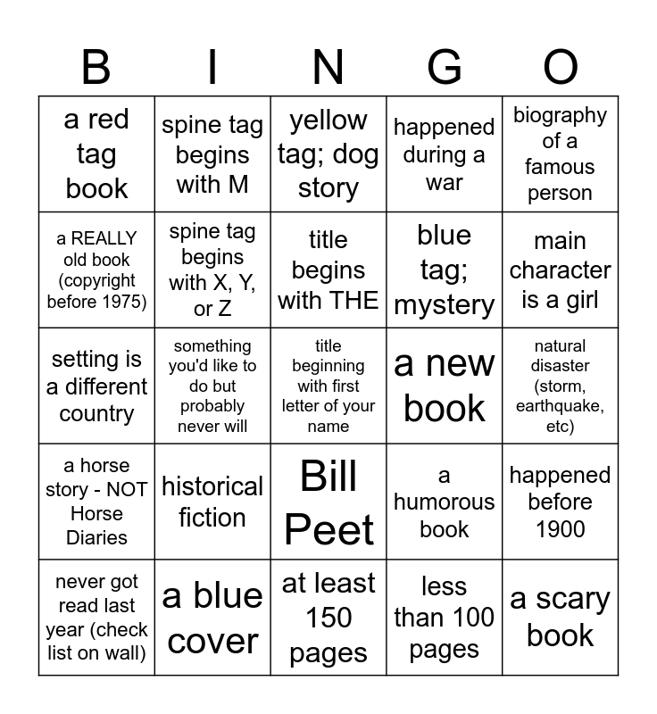 This bingo card has 30 words: a blue cover, an old book (copyright before 2000), something you'd like to do but probably never will, an I Survived book, a red tag book, yellow tag; dog story, spine tag begins with X, Y, or Z, Bill Peet, a new book, at least 150 pages, natural disaster (storm, earthquake, etc), title beginning with first letter of your name, less than 100 pages, a scary book, main character is a girl, "star" in the title, a humorous book, a horse story - NOT Horse Diaries, historical fiction, biography of a famous person, setting is a different country, wild animal story, spine tag begins with M, blue tag; mystery, a REALLY old book (copyright before 1975), happened during a war, happened before 1900, never got read last year (check list on wall), title begins with THE and a book from a series.