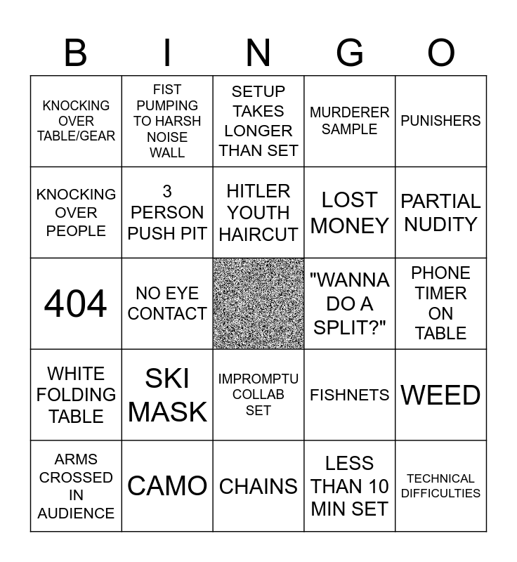 This bingo card has a free space and 24 words: SKI MASK, CAMO, HITLER YOUTH HAIRCUT, ARMS CROSSED IN AUDIENCE, PUNISHERS, KNOCKING OVER TABLE/GEAR, KNOCKING OVER PEOPLE, FIST PUMPING TO HARSH NOISE WALL, "WANNA DO A SPLIT?", IMPROMPTU COLLAB SET, LOST MONEY, 404, FISHNETS, WEED, 3 PERSON PUSH PIT, LESS THAN 10 MIN SET, PHONE TIMER ON TABLE, SETUP TAKES LONGER THAN SET, PARTIAL NUDITY, NO EYE CONTACT, TECHNICAL DIFFICULTIES, WHITE FOLDING TABLE, MURDERER SAMPLE and CHAINS.