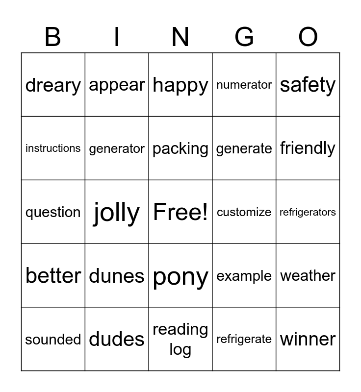 This bingo card has a free space and 24 words: dunes, dudes, packing, sounded, safety, dreary, instructions, appear, customize, pony, generate, question, example, weather, generator, refrigerate, refrigerators, happy, friendly, jolly, winner, better, numerator and reading log.