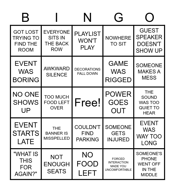 This bingo card has a free space and 33 words: RUN OUT OF FOOD, TECH NOT WORKING, TOO MUCH FOOD LEFT OVER, WRONG EVENT DAY/TIME ON FLYER, EVENT STARTS LATE, AWKWARD SILENCE, GUEST SPEAKER DOESN'T SHOW UP, "WHAT IS THIS FOR AGAIN?", EVERYONE SITS IN THE BACK ROW, WEATHER RUINS THE EVENT, DECORATIONS FALL DOWN, PLAYLIST WON'T PLAY, THE FIRE ALARM GOES OFF, STUDENTS GRAB THE FOOD AND LEAVE, POWER GOES OUT, SOMEONE MAKES A MESS, NOT ENOUGH SEATS, NO ONE SHOWS UP, THE BANNER IS MISSPELLED, SOMEONE GETS INJURED, COULDN'T FIND PARKING, STOOD IN LINE FOREVER, GOT LOST TRYING TO FIND THE ROOM, THE SOUND WAS TOO QUIET TO HEAR, NO FOOD LEFT, SOMEONE'S PHONE WENT OFF IN THE MIDDLE, NOWHERE TO SIT, GAME WAS RIGGED, EVENT WAS BORING, EVENT WAS WAY TOO LONG, YOU ONLY WENT BECAUSE A FRIEND MADE YOU, FORCED INTERACTION MADE YOU UNCOMFORTABLE and RAN OUT OF FREE STUFF BEFORE YOU GOT ANY.