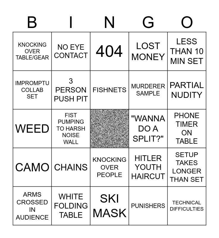 This bingo card has a free space and 24 words: CHAINS, WHITE FOLDING TABLE, FISHNETS, ARMS CROSSED IN AUDIENCE, LESS THAN 10 MIN SET, KNOCKING OVER TABLE/GEAR, IMPROMPTU COLLAB SET, NO EYE CONTACT, "WANNA DO A SPLIT?", KNOCKING OVER PEOPLE, MURDERER SAMPLE, WEED, HITLER YOUTH HAIRCUT, SETUP TAKES LONGER THAN SET, 3 PERSON PUSH PIT, PUNISHERS, PHONE TIMER ON TABLE, 404, PARTIAL NUDITY, FIST PUMPING TO HARSH NOISE WALL, TECHNICAL DIFFICULTIES, CAMO, LOST MONEY and SKI MASK.